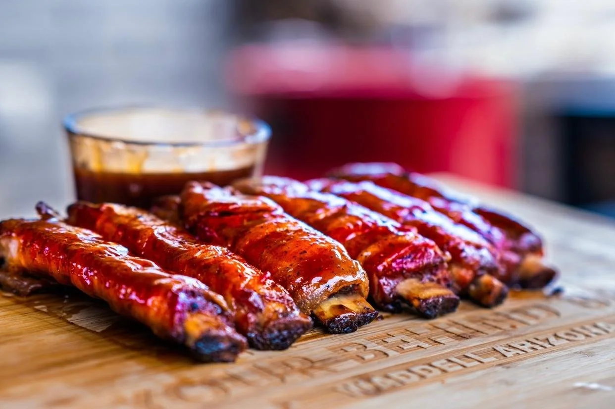 Once the bacon is cooked to your liking, the ribs are done. Apply BBQ sauce to each individual rib.